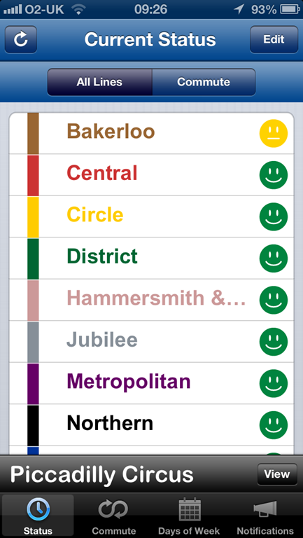 As part of my overhaul of “I May Be Late” (now known as Commuter Pal), I’m adding in some location based services to the app. The idea is that when you move within range of a tube station, you’ll get quick access to the status of the lines and current departure times. I’m working my way slowly through the code, but this is what I’ve got so far. It’s not very impressive to see….