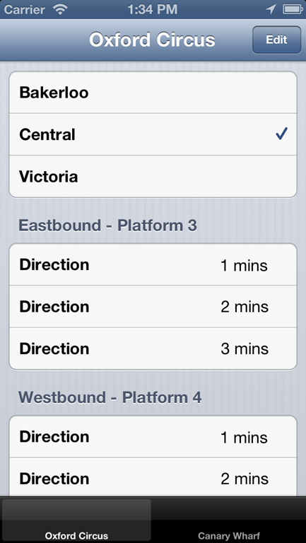The app just has two tabs (I might add two mores) and that will just present the basic information for that station to you. This way you get presented with the information you’re most interested in. I’ll probably add location services to give alerts of issues as you get close to the station.