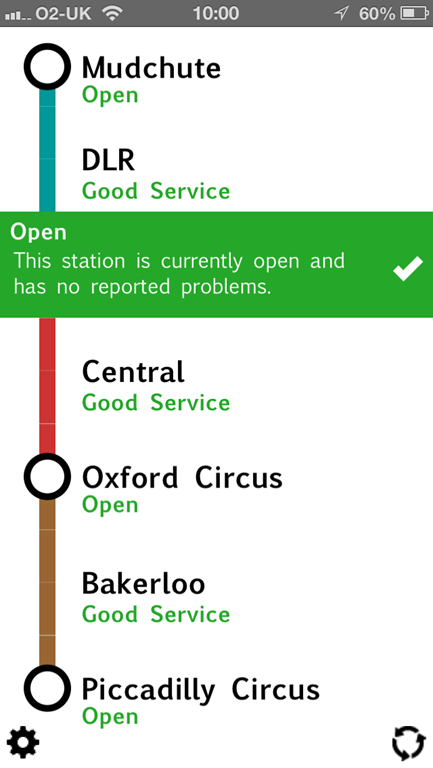 Rather than overload the user with information about the entire London underground network, Commuter Pal aims to provide them only with information relevant to their commute. In addition to just the line information, Commuter Pal will also give you the status of the stations you use. Here is an example.
