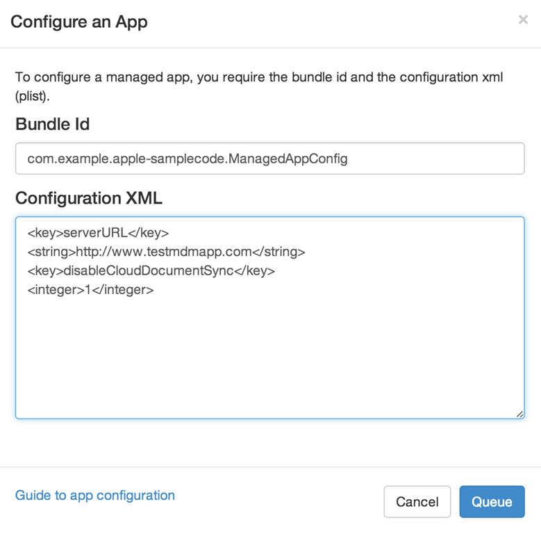 The configuration has two settings, serverURL and disableCloudDocumentSync. This configuration is in Apple’s stand PList format. I’m using http://www.testmdmapp.com as the URL, but you can choose any value you wish.I’m also setting the disableCloudDocumentSync value to 1, which will turn off the switch. Click Queue.