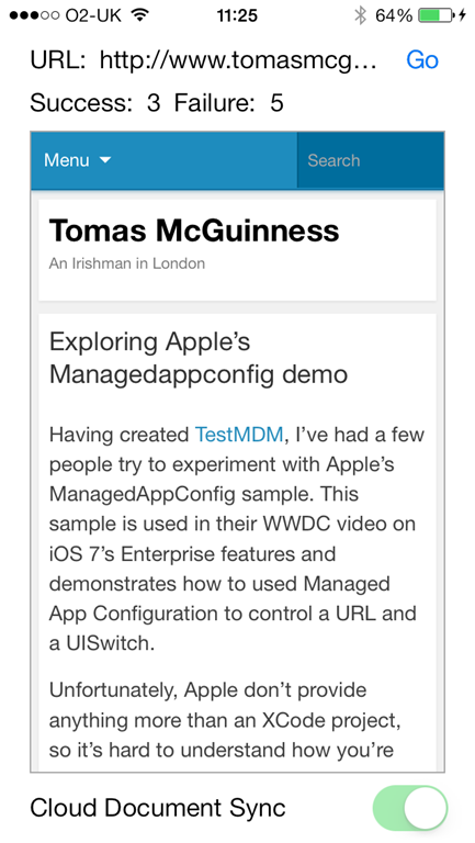 Now, using TestMDM, update the serverURL value to be a site you know exists. In my case, I’m using www.tomasmcguinness.com. Read part one to see how you update the configuration. Once the app has updated the URL value, hit Go another couple of times. The Success count should increase accordingly.