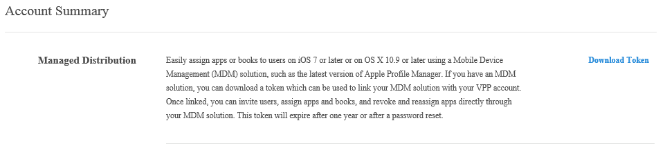 To get your VPP token, you must first visit https://vpp.itunes.apple.com/ You can then signup your organisation for VPP using a new or existing Apple ID. Once you’ve signed up, open the Account Summary page and download the token.