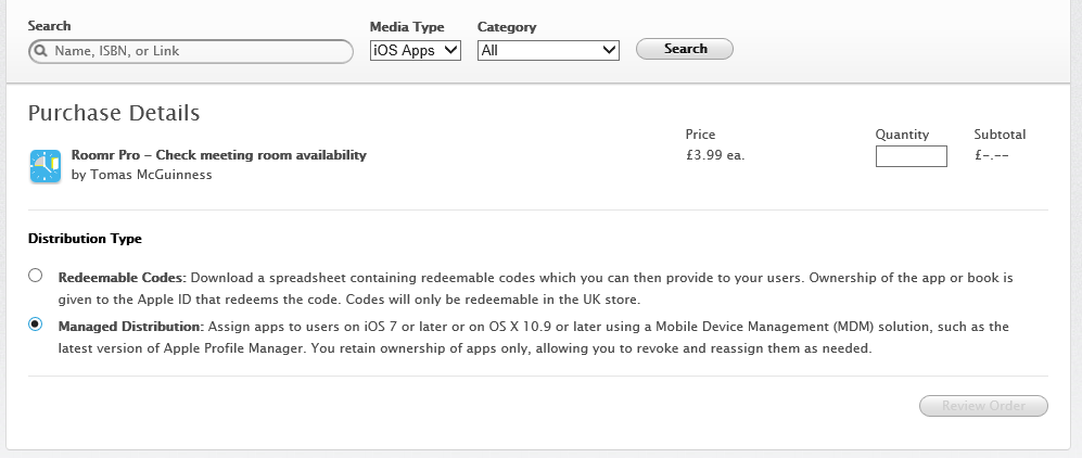 Once you’ve registered a user account, you can then assign a license to them. A license represents one installation of an app. You purchase them via the Apple VPP page where you registered earlier. You select the app and purchase a certain quantity of licenses.