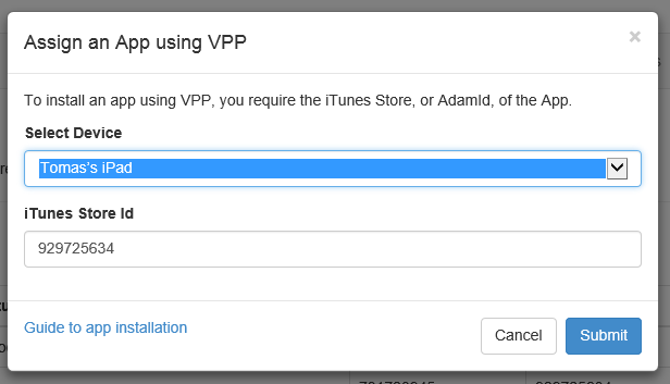 Clicking it will bring up the familiar “Install An App” dialog, with a small change. There is now a field for an AdamId (an iTunes Store Id for an App). Just choose the device and hit submit. You must be targeting a device that is signed into iTunes using the AppleID you associated with the VPP Account you created in step two. It’s confusing I know, but that’s the way it works!