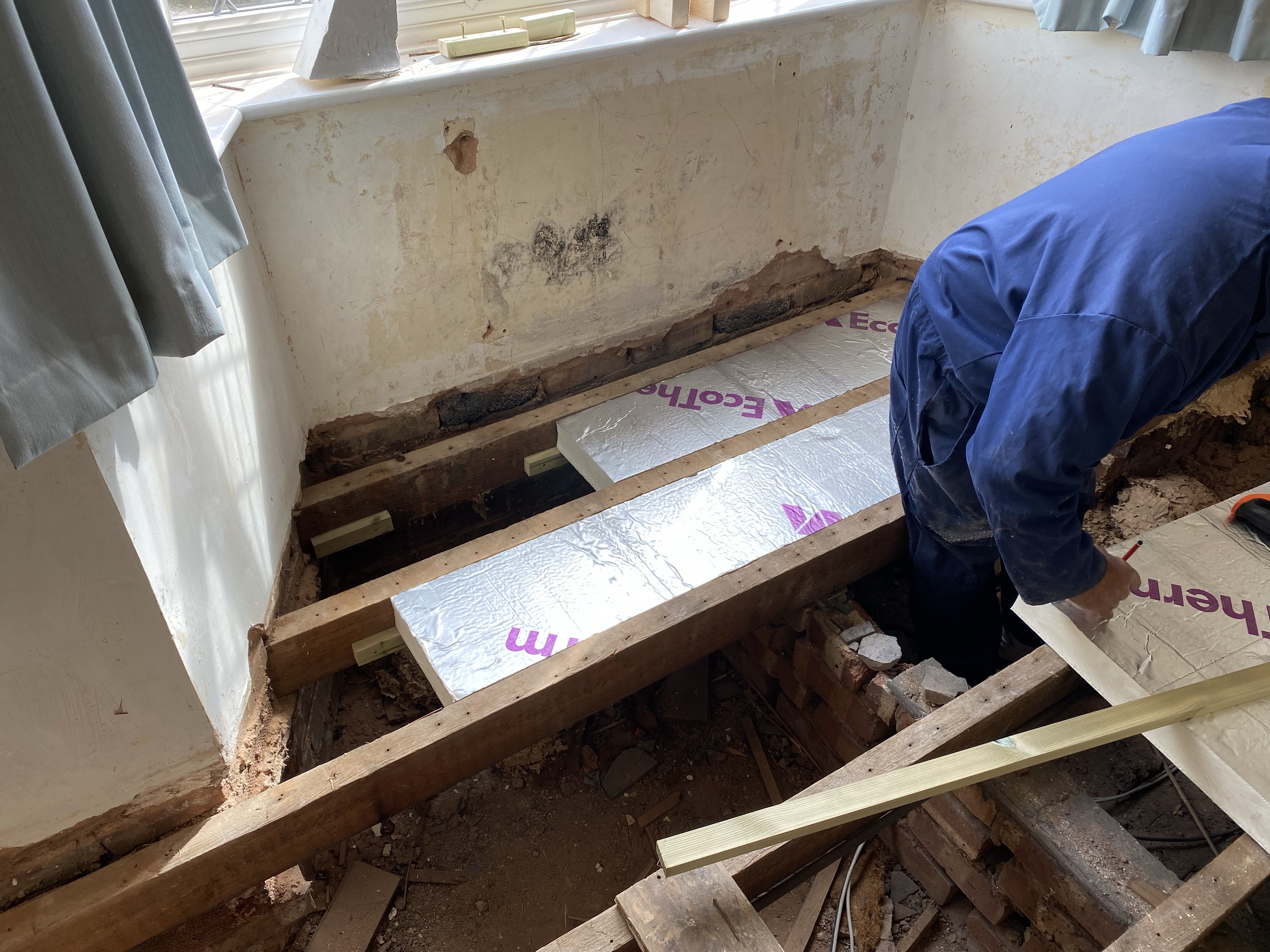 I spent quite a few hours researching the insulation of suspended floors and settled on the use of PIR. This is a solid foam insulation that has foil backing. It’s more efficient than rock wool, meaning you need less of it for the same level of insulation.