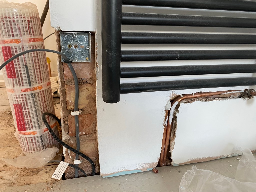 Our plan was two fold; we would install underfloor heating and a towel rail. Our new bathroom has three external walls, but as it’s cavity wall, it won’t be as cold. We aren’t tiling the entire room this time, so the walls shouldn’t be as cold.