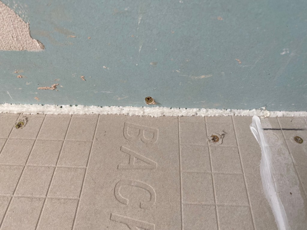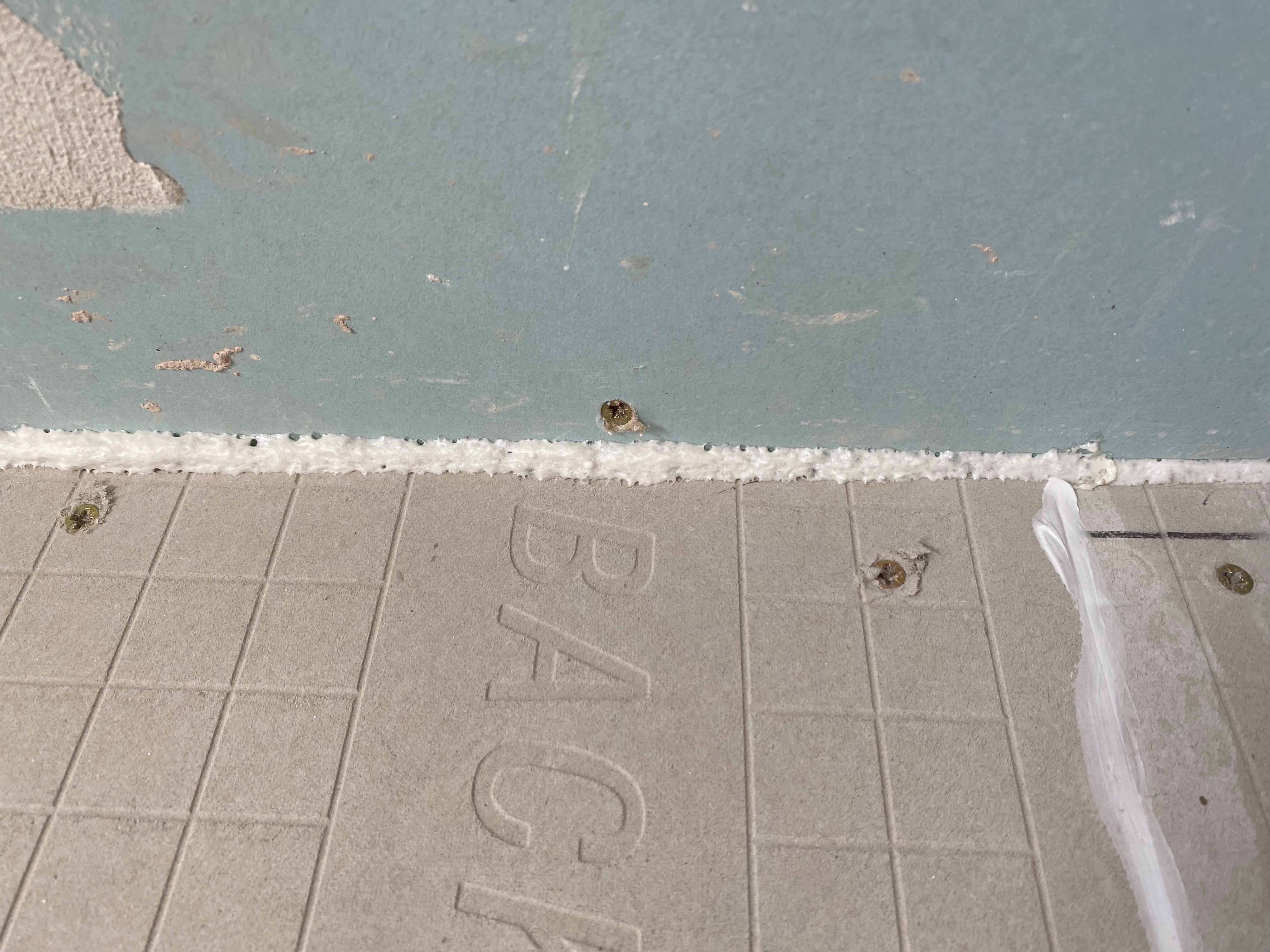 The tiler, who was going to put down the self levelling layer over the mat asked me to make sure there were no gaps around the edges of the room. He said the liquid would simply pour through the holes making his job very difficult. To tackle this, I used a mixture of expanding foam for the larger gaps and decorators caulk for the smaller gaps.