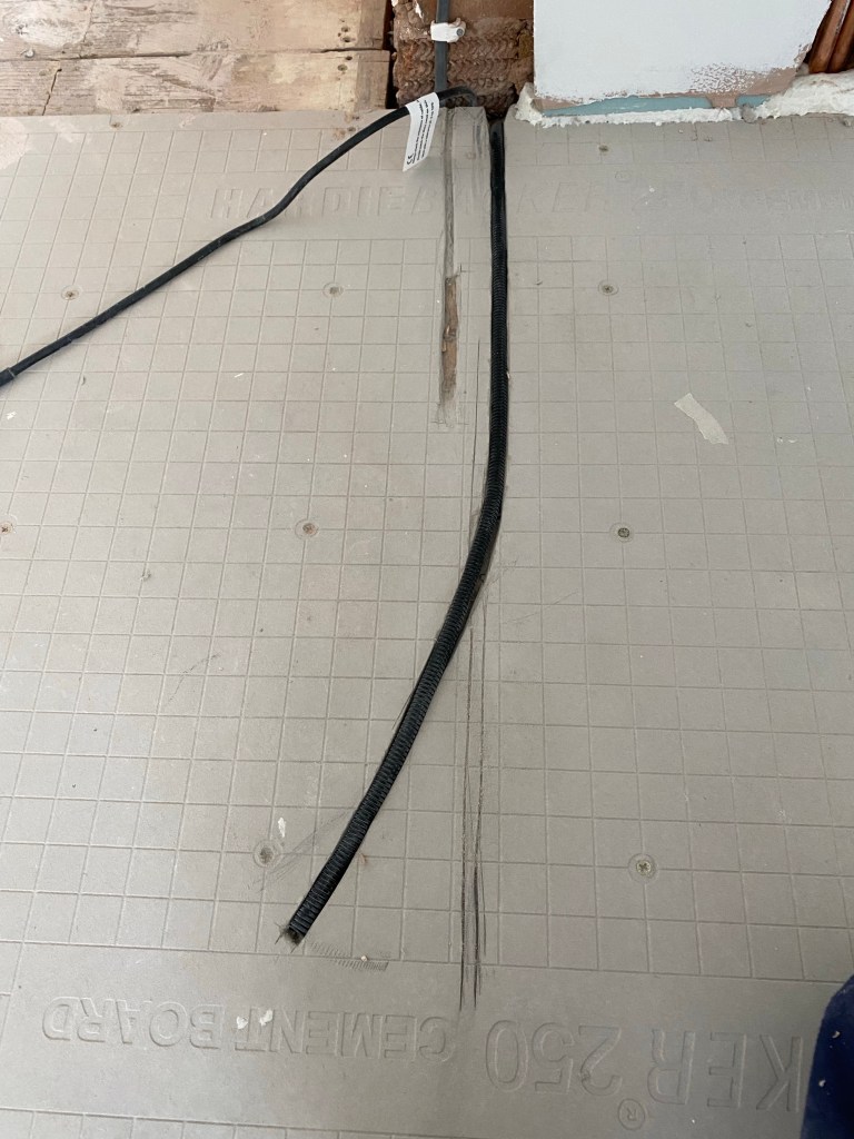 The white conduit holds the mat’s power cable and the temperature probe. Heatmiser recommend that the probe can be accessed and removed in the event it fails. I used the white conduit down the floor and then a 7mm flexible black conduit, which would under the tiles.