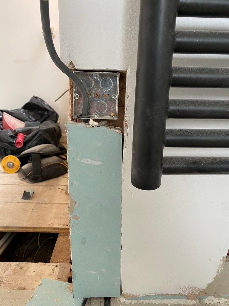 Unfortunately, a large lump of plaster fell off the wall when the electrician was trying to cut out the box. Once I had positioned the mat’s wire and probe, I used some bonding to stick a lump of plasterboard into position.