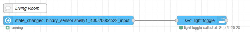 To connect these two things together, I used NodeRed. I use NodeRed for all of my automations. The automation is just two nodes. The first listens for state changes from the _input entity and it then toggles the LIFX bulb on or off.