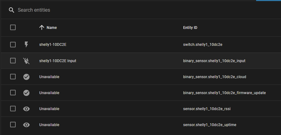 For me, I use HomeAssistant, so I use the Shelly Integration to add the relay. When you open the device, you’ll see there are seven entities. The switch.shelly1_xxxx entity points to the actual relay, so toggling this switch will actually toggle the relay on and off.