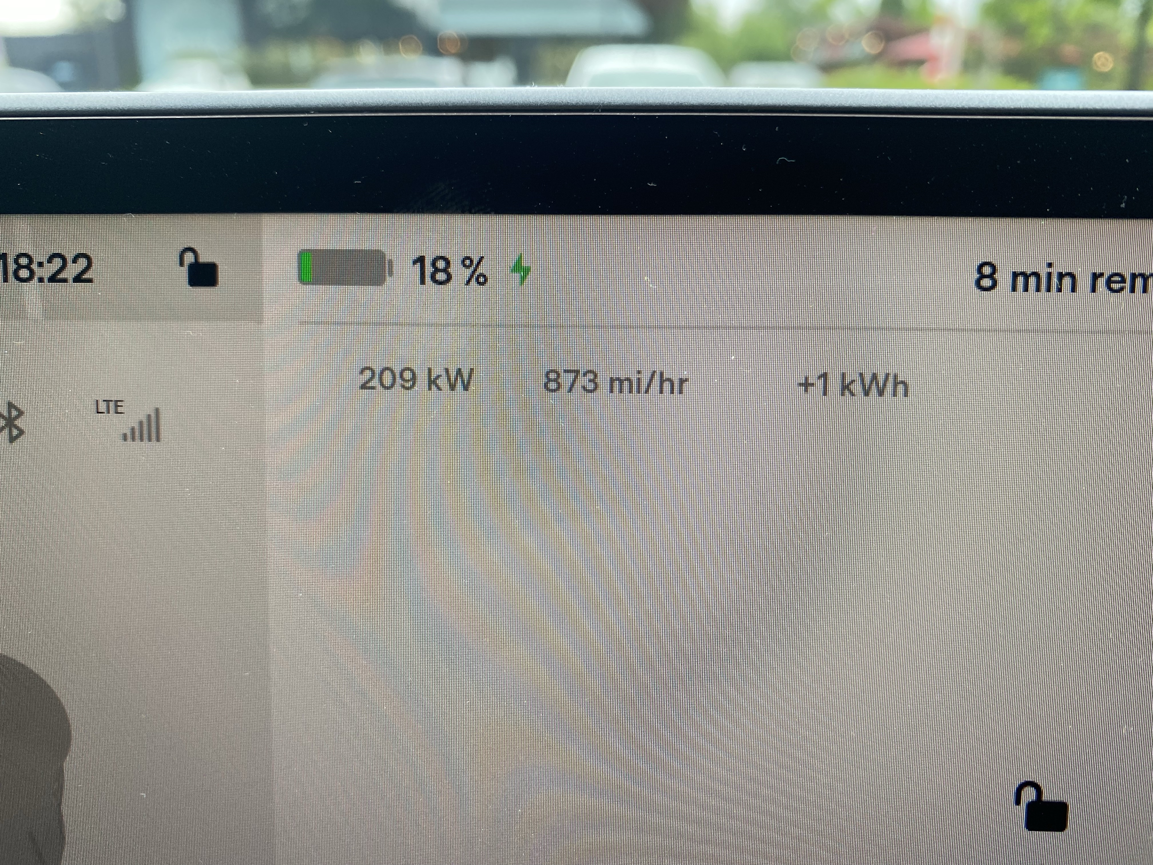 The Tesla route planner said that a 25 minute stop was necessary, but as the other bays filled up, this increased to 45 minutes. Instead of 120kW, we got 50kW.