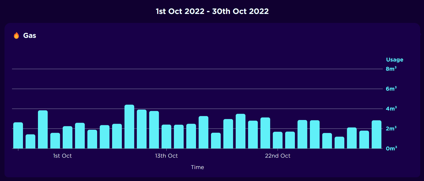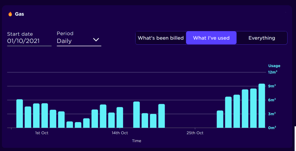 In Oct ’21, we used 93.2m3 of gas, which is approximately 1024kWh. We were away for eight day’s that month, so the usage was zero.