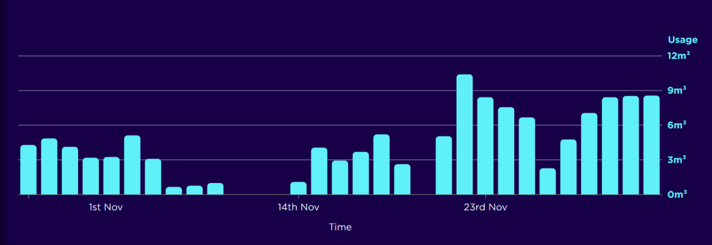 November 2022 was a different story. We were out of the house for a week or so, due to building work, so the heating was turned way down. Total usage was 119m3. If I factor in the time we were absent, the average usage is 6m3 or 70kWh per day.