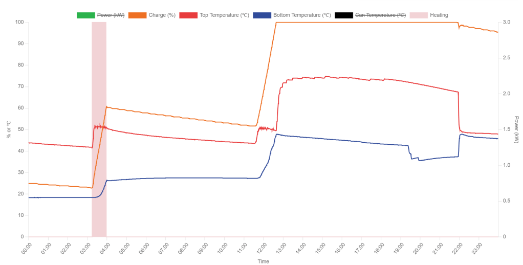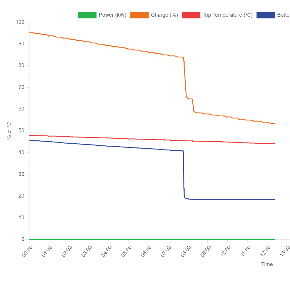 It’s not until 10pm that we see something happen. The temperature suddenly drops. I’m not sure why this isn’t a nice gradient, but that doesn’t matter. You’ll see the percentage charge starts to drop as the water cools.