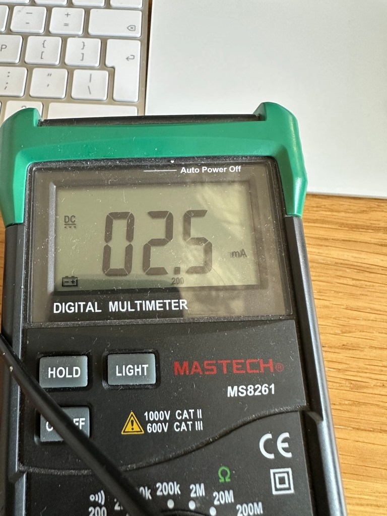 After that *ah-ha* moment, I moved to the 10A input on my multi-meter and the problem went away!! This only confirmed the low, low power consumption, which was good news!!