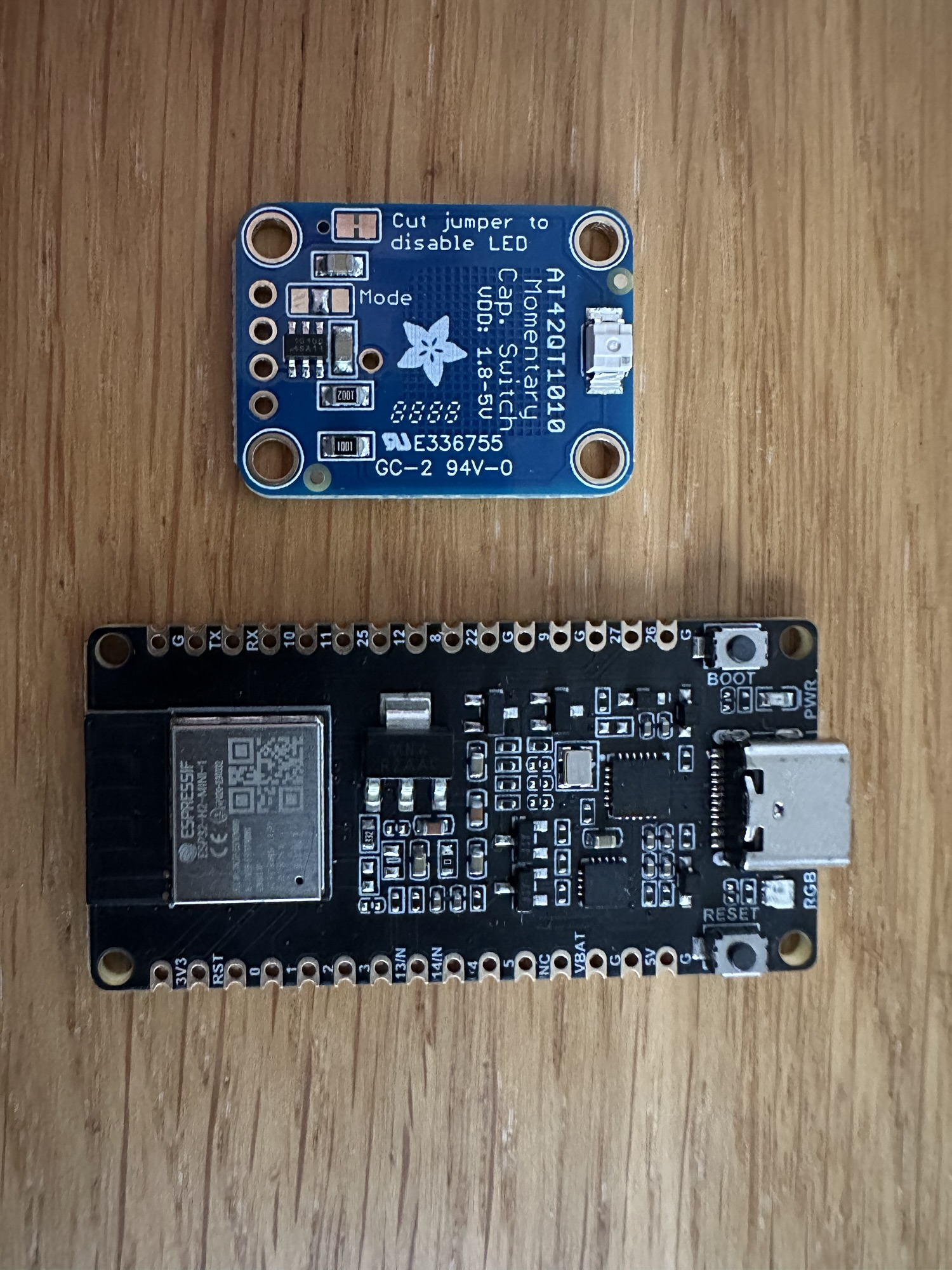 After a lot of hacking around with the samples, I got the capacitive button wired up and generating button presses! Espressif made this easy with their IoT espressif/button component.