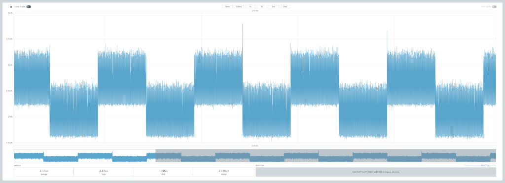 Very familiar pattern! 3.2mA when the LED is on and about 2.5mA when it’s off. Average consumption was 2.17mA.