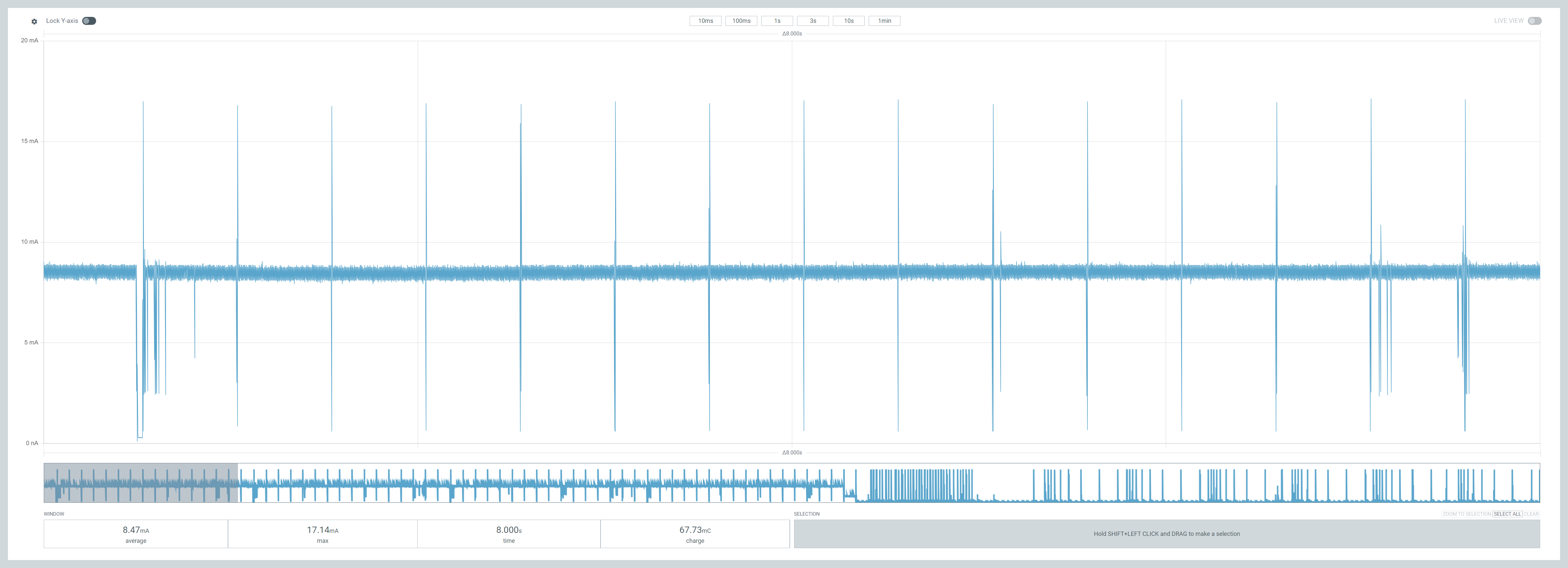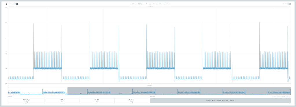 Zooming in showed the “off” periods used about 300µA on average. This was higher than the DK consumption, but perfectly acceptable for my needs!