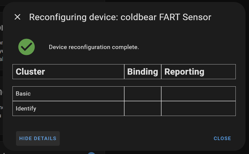 When I added the device to Home Assistant, everything appeared except the battery information. Since I didn’t fully understand what I was doing with the custom macro, I figured it was my definition. Attempting to reconfigure the device showed the same issue I saw when I started this project: reporting failure.