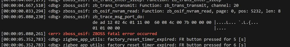 I felt that the addition of the Power Config Cluster was causing this, as the existing Temperature Clusters worked. I’d read some forum posts about how ZBOSS loads data from NVRAM (Non-Volatile RAM) on startup. I guessed that maybe there was invalid data being saved, causing a crash on load.