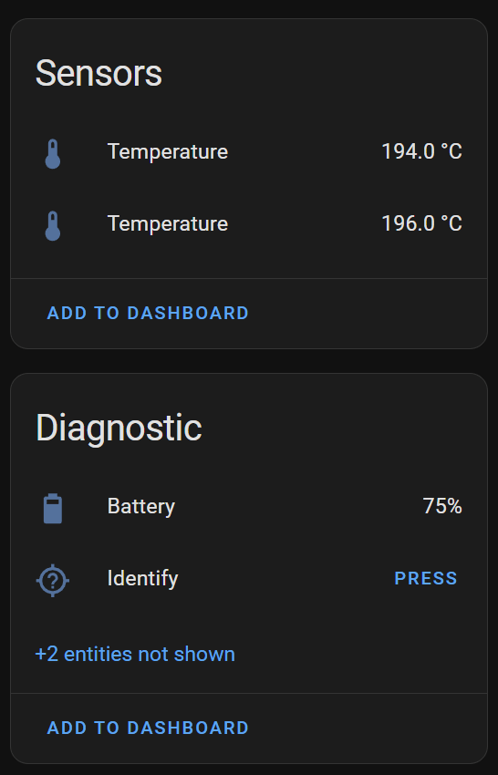 Home Assistant picked up the two temperature sensors and the battery measurement, but reporting showed warnings as expected.