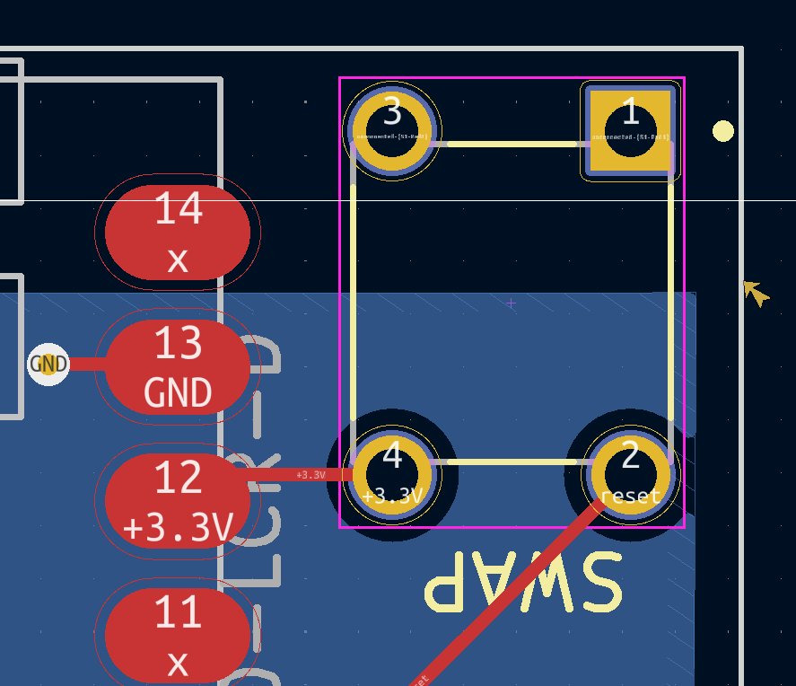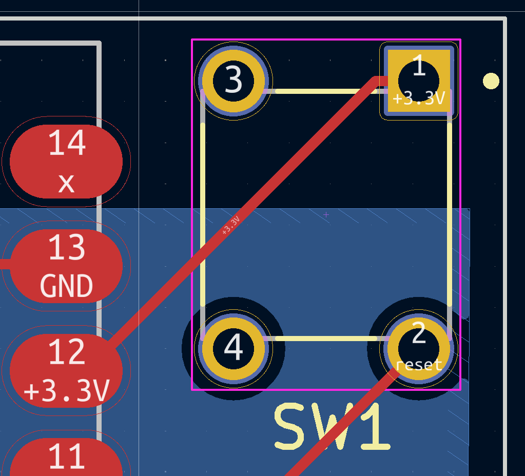 When the PCB was generated and I added the tracked, it looked like this. Pin 1 connected to 3.3V and pin 2 went off to the reset. Looked fine!