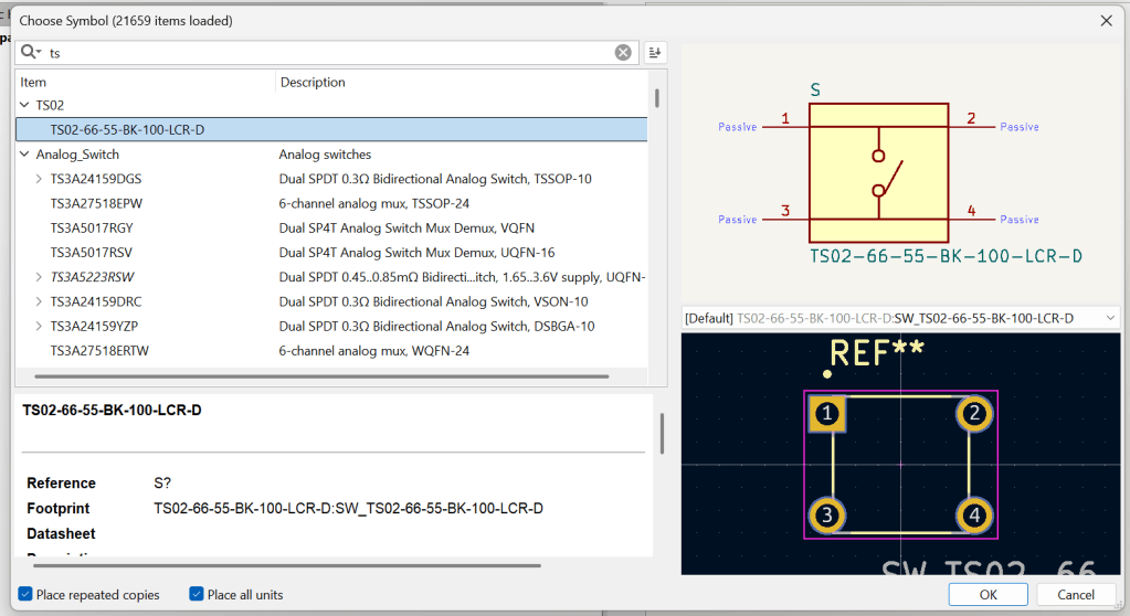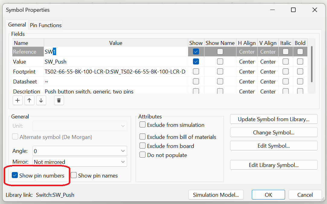 I then selected the TS02 as the footprint. This is the physical PCB layout for this schematic item. At this point it will be helpful to display the pin numbers, which can be turned on using KiCAD. Double clicking the symbol opens its properties. You can then turn on “Show pin numbers”