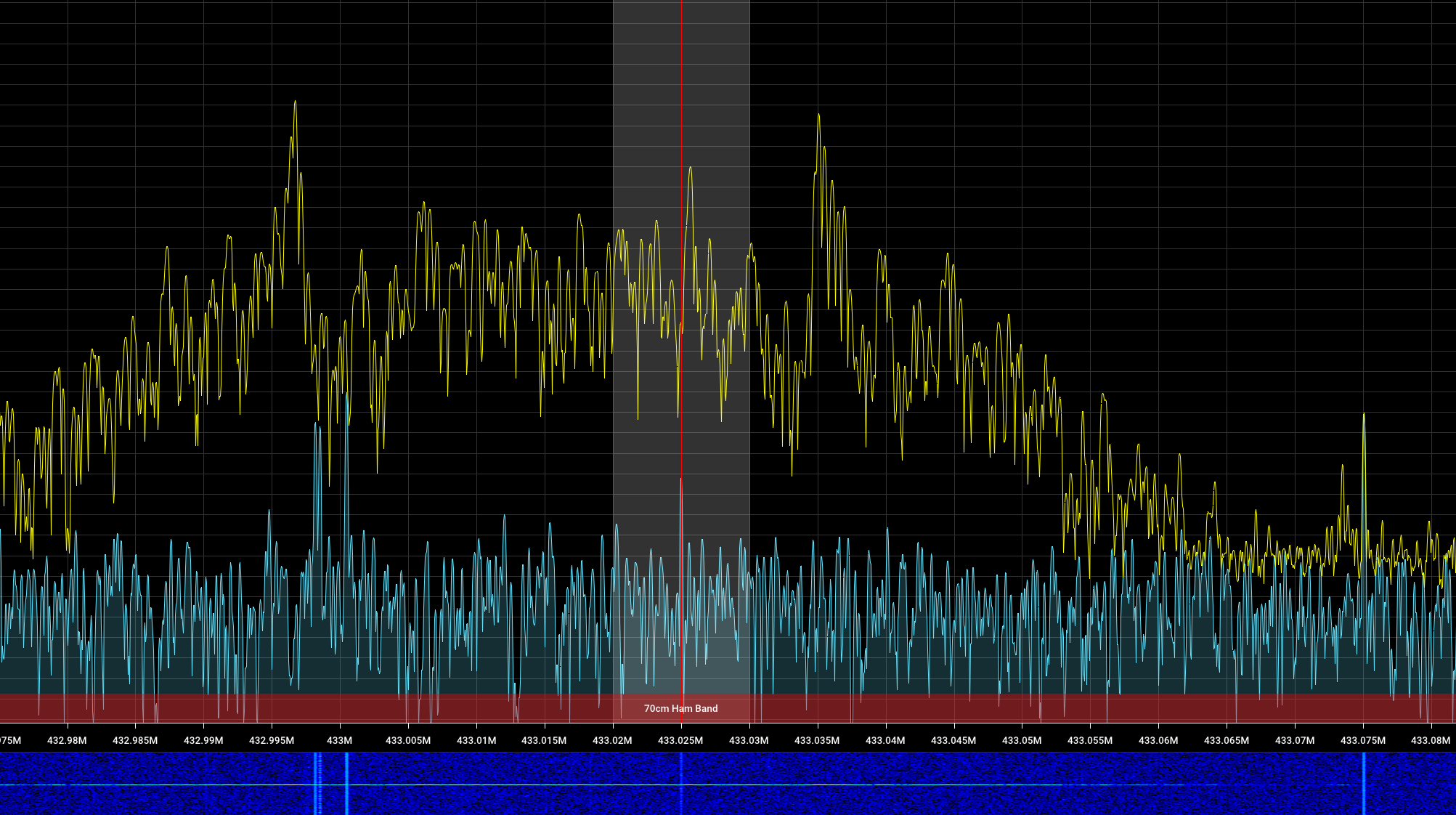 I went back to SDR++ and immediately noticed something very strange! The same pulse, every second, was visible around three different frequencies. I could see the two spikes around 432MHz, 433MHz and 434MHz. Once I moved left or right of that, it disappeared.