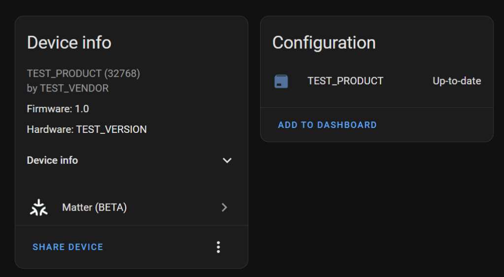 Lastly, I have a setup code of 20202021 and a discriminator of 3840. These are stock values from the esp-matter samples. They are actually present in the QR code above, encoded into it.