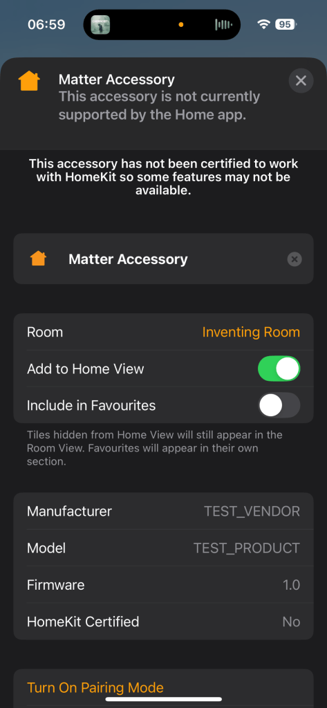 Matter lets you have more than one controller for an individual device, so I paired the device with Home Assistant too (using the “Turn on Pairing Mode”)