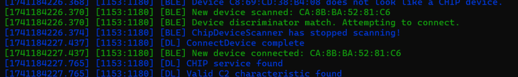 Once you run this command, the chip-tool should find your device by scanning using Bluetooth: