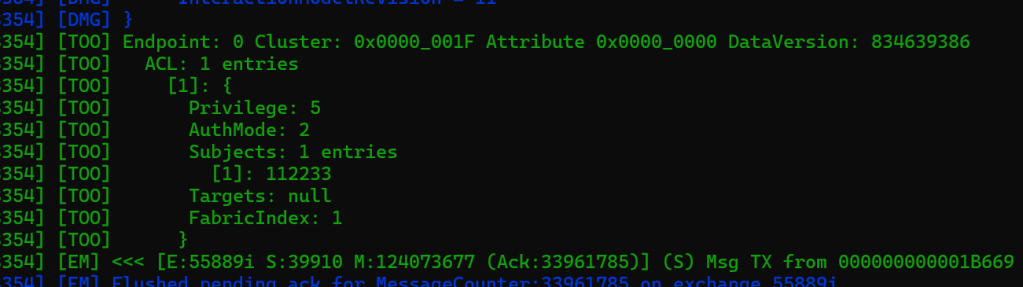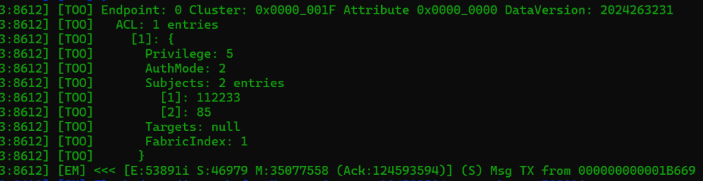 It’s important to note that this command will *replace* the ACL on the device, so if you don’t include 112233, I think you lock the Controller out, meaning the chip-tool will stop controlling the device!