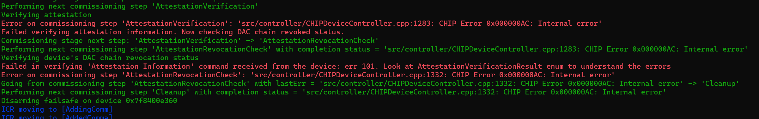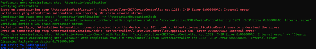 We’re using a test tool, so we have a test certificate. This means that the chip-tool fails to verify the device is genuine.