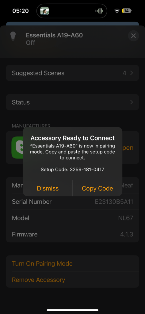 Once it has been added, you can now commission it with a second controller, the chip-tool. To start this process, you must put the device into Pairing Mode. iOS makes this easy.
