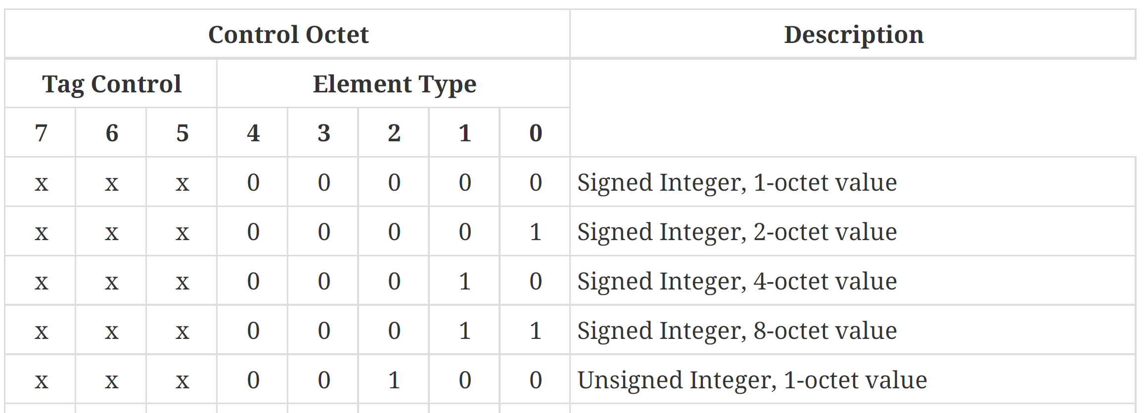 The Control Octet is then specified like this (not the full list)