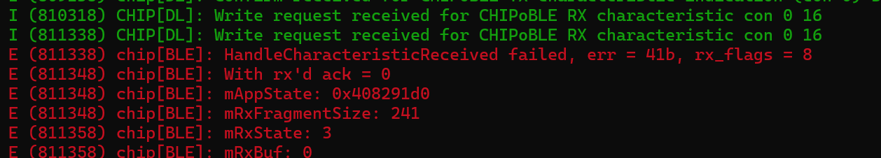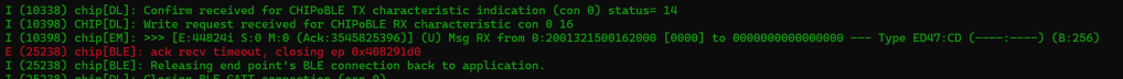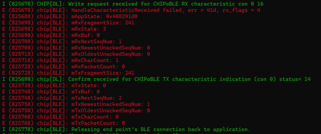 The messages with the “>>>” are what I see when using the official chip-tool, so I know I’m moving forward!