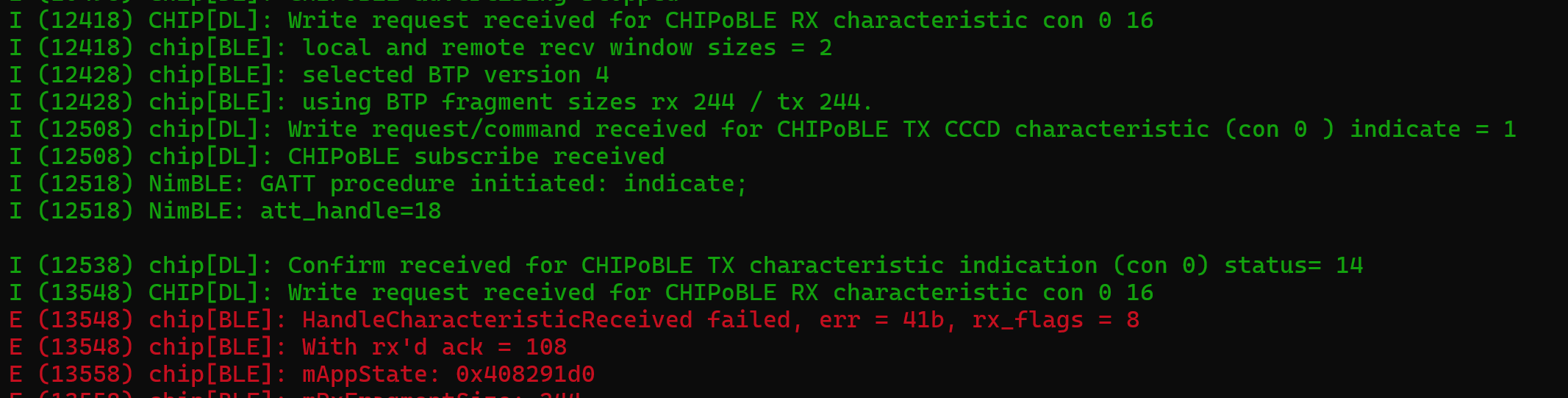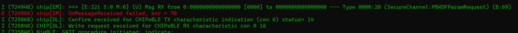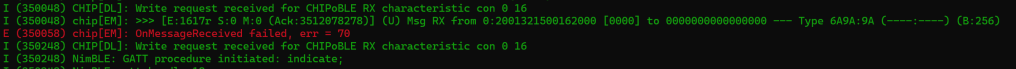 This time, I got a different error again. According to DeepSeek, 70 maps to CHIP_ERROR_INVALID_MESSAGE_LENGTH. This means either my BTP packets are wrong or there might be an issue with my TLV encoding.