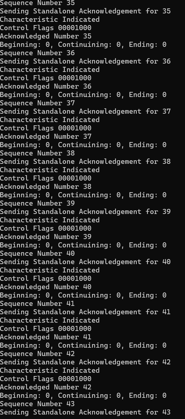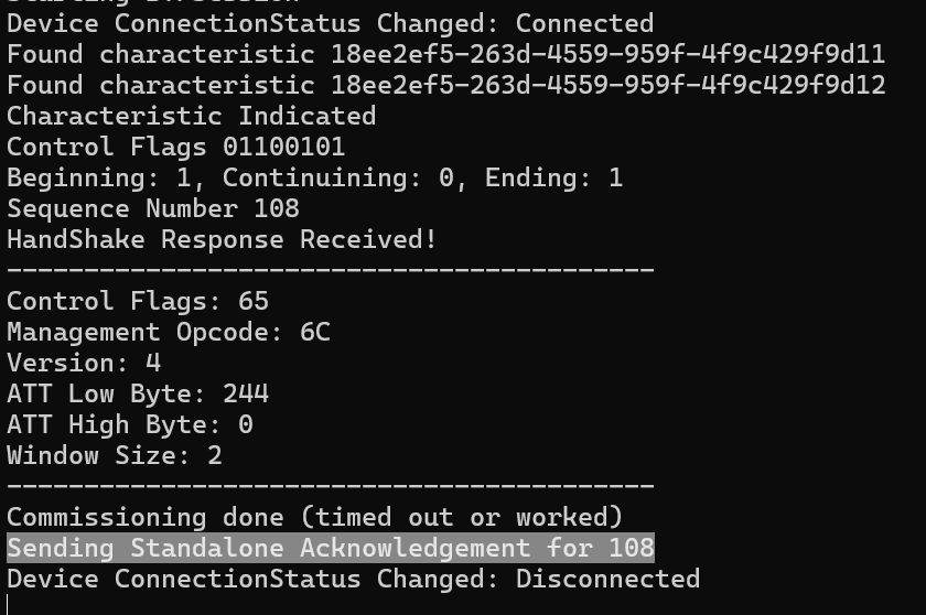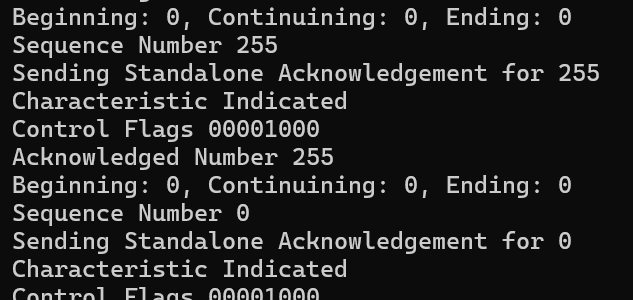 When the ESP32-H2 responds to the Handshake, it tells me that its window size is 2. I think this means that I can only have two messages outstanding at any one time. For example, if I sent it 10 BTP messages, it wouldn’t handle it. This is for managing memory.