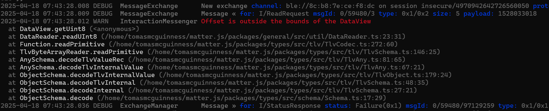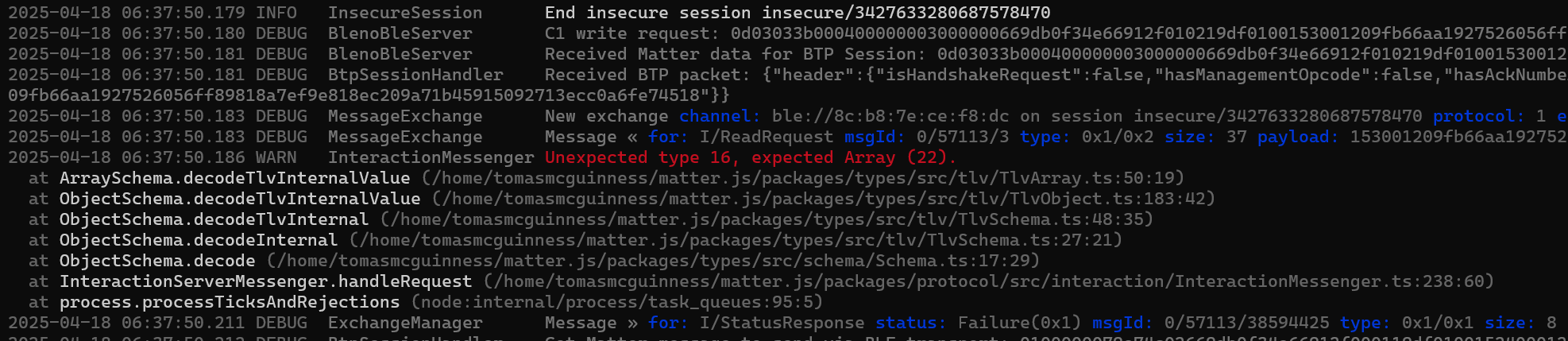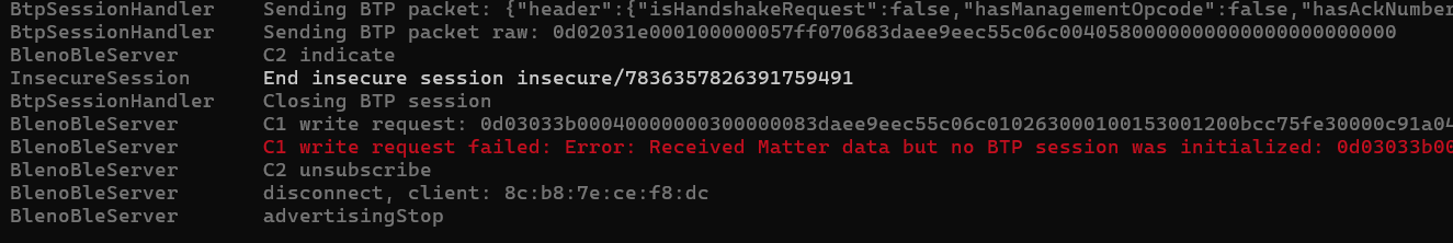 At this point, I decided I need some help. Some human help. I found a Discord channel called Matter-Integrators and posted my question on there. User Apollon77 came back really quickly and confirmed that the BLE connection should indeed remain open. He then indicated that there might be an issue in matter.js itself!