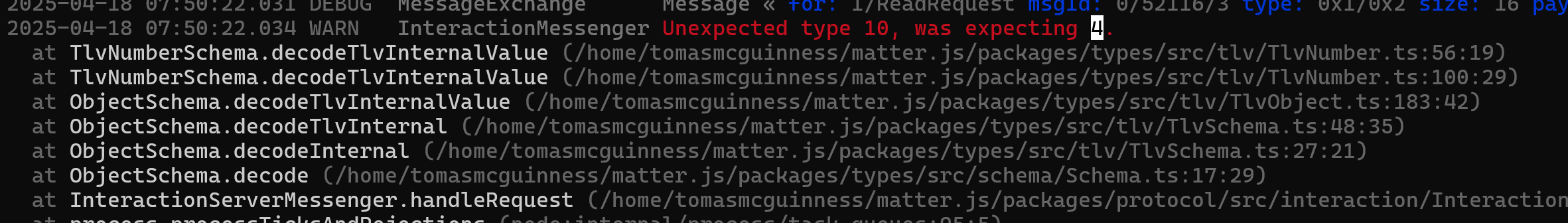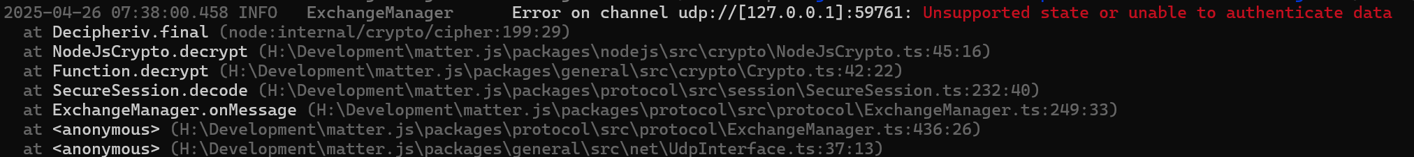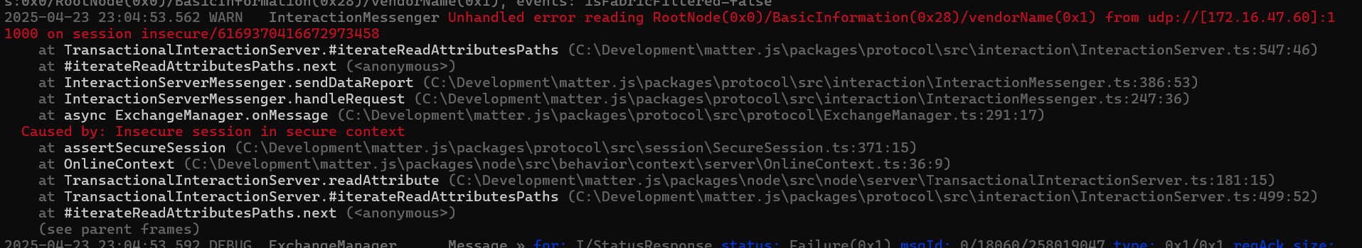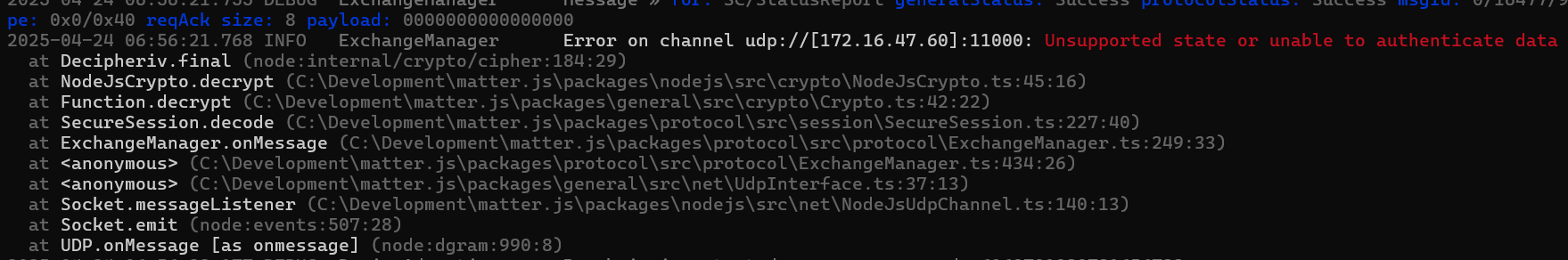 What struck me at this point is that matter.js happily read and responded to my message, but it wasn’t encrypted! Perhaps I could avoid encryption for the time being??