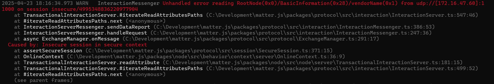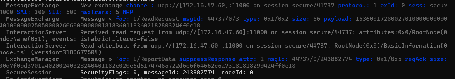 Received read request from udp://[172.16.47.60]:11000 on session insecure/6169370416672973458: attributes:0x0/RootNode(0x0)/BasicInformation(0x28)/vendorName(0x1), events: isFabricFiltered=false
