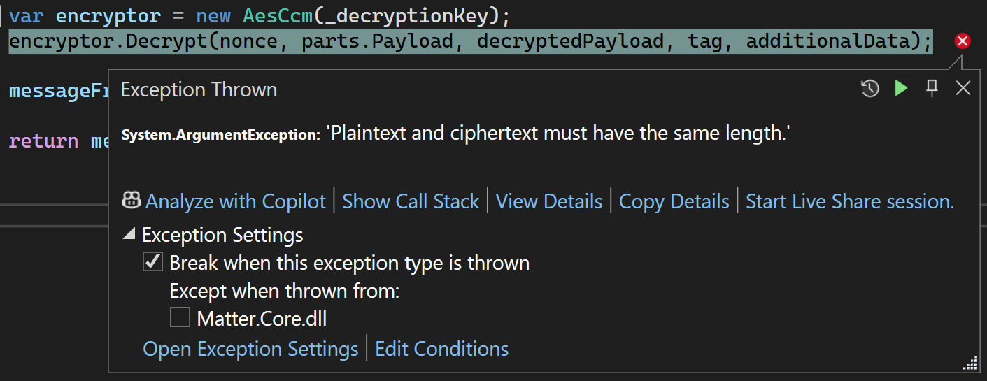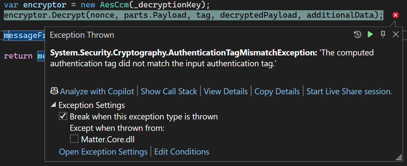 I checked my code and face-palmed (a common occurence). When I got this all working, I was careful to match my encrypt and decrypt keys with those reported by matter.js. My mistake was obvious!! The encrypt key on my C# side *won’t* be the encrypt key on the matter.js side 🤣