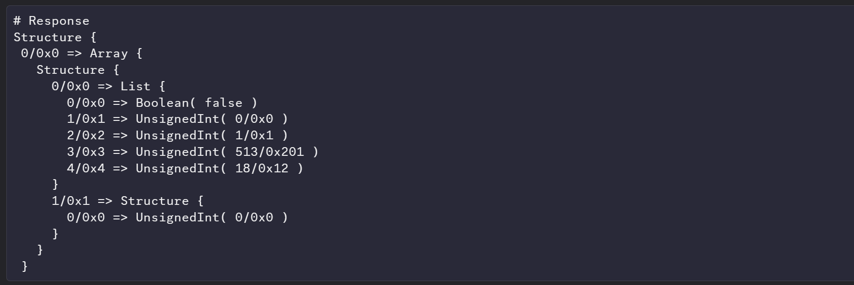 At this point, I figured it was about time to steal more of the matter.js code 🙂 You see, they have a really nice debugging view of the TLV message. It looks something like this