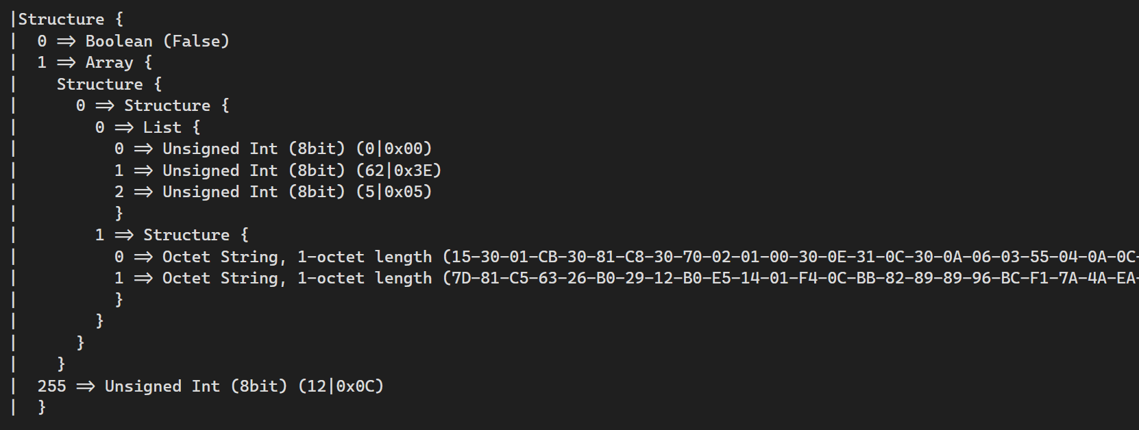 Which *perfectly* matched up with the InvokeReponse and CSRResponse payloads! The 0x05 in the List refers to the CSRResponse command. At this stage, I didn’t know if the two long Octet Strings were correct, but damn if this didn’t make feel smug 🙂