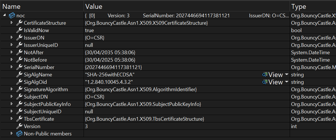 I ended with NOC (Node Operational Certificate) and in the next post, I’ll attempt to install this. Once that’s installed, I think I will have a working Fabric. I can then attempt to execute the CASE steps. Getting ever close to my primary goal of turning on a light switch.