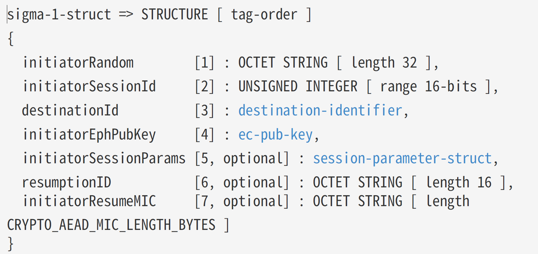 The first message to be exchanged in CASE is the Sigma1. Similar to the PASE message, it includes some key and random values.
