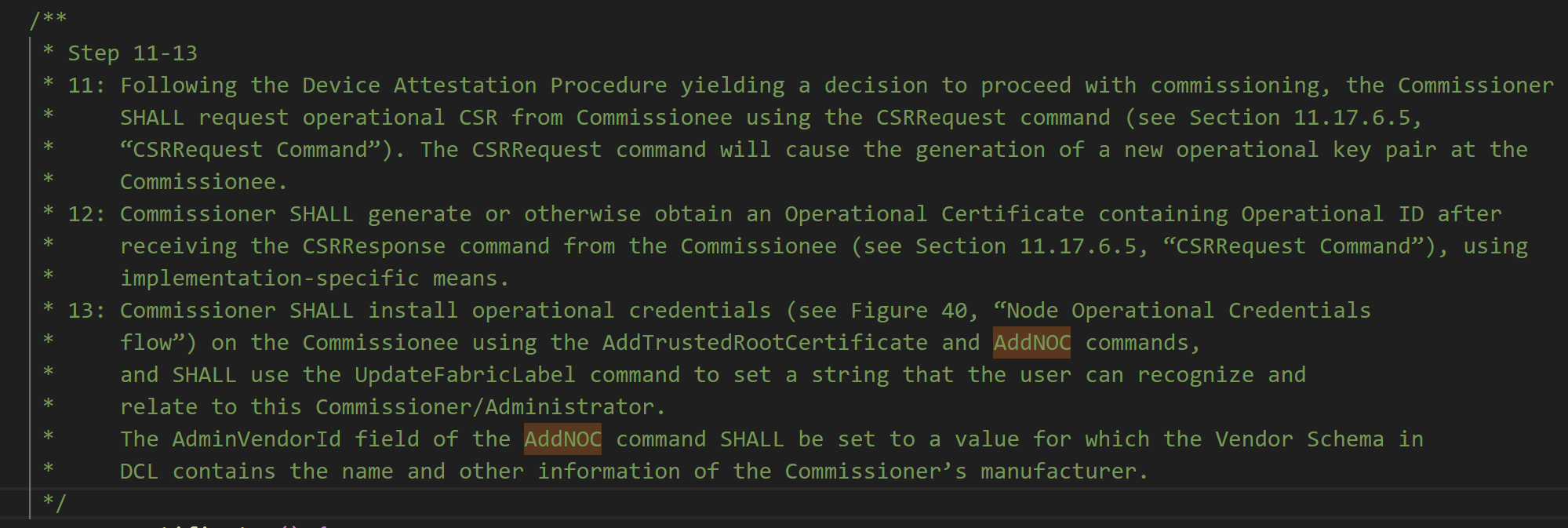 The final call in this trio is the AddNOC, which will attempt to install this certificate in the device.