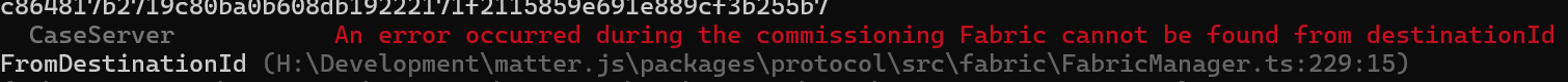 There is something wrong with the destinationId I’m sending. From what I can tell, when you send a CASE message, it tries to find the fabric the node belongs to.