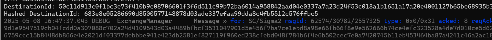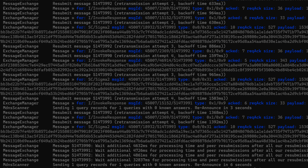 I spend some time cleaning up my own logging (multiple statements into single Console.Writeline). I also looked at how my acknowledgement code. I realised that because I was creating new PASE Exchanges for each message, I needed to ack the last received message using a standalone ack. This was because a message on a new exchange didn’t appear to ack one from a different stream. Which makes sense since a message is identified by sessionId/exchangeId/messageId.